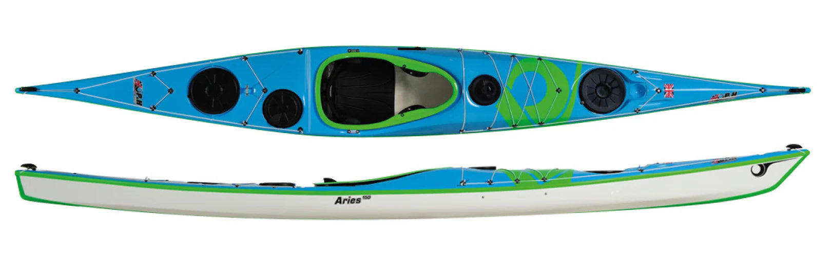 The P&H Aries has evolved from the long established Delphin with the advantages of composite construction used to tweak and develop the form into a kayak that is an absolute joy to paddle and excels in surf, tide-races and lively waters. There are two models one just over 15ft the other just under 16 so bridging the compact to mid-sized range. With a squared off stern to maximise waterline length the Aries will cover a decent distance while still being agile and playful. There is also sufficient volume to pack enough compact camping kit for a week away and a four hatch design to help you organise your kit.